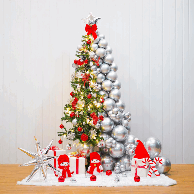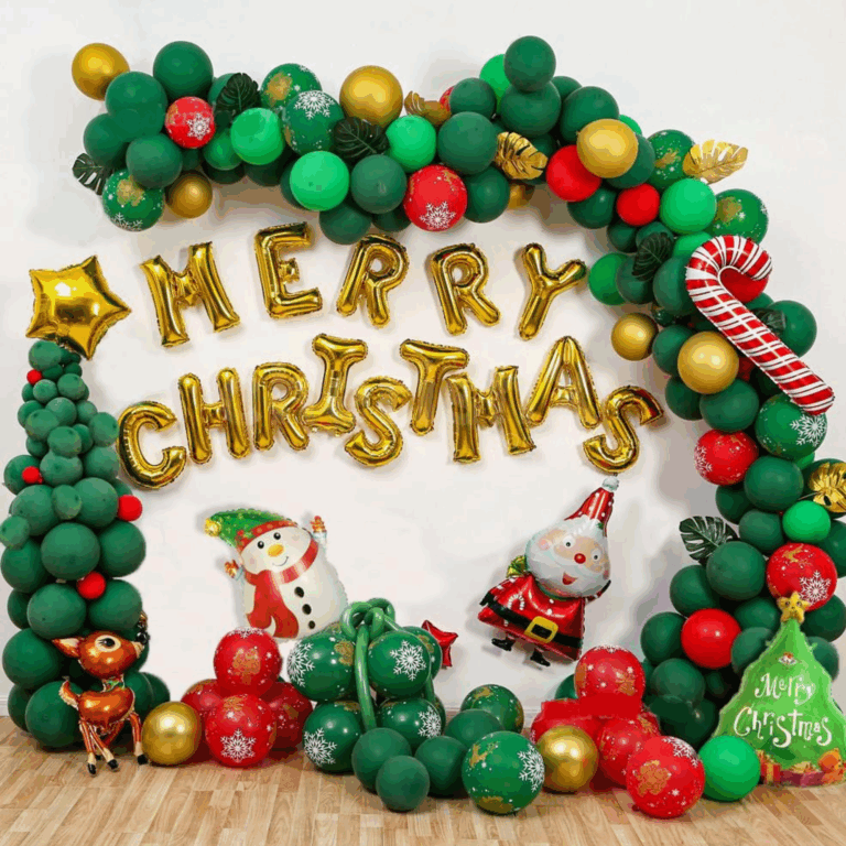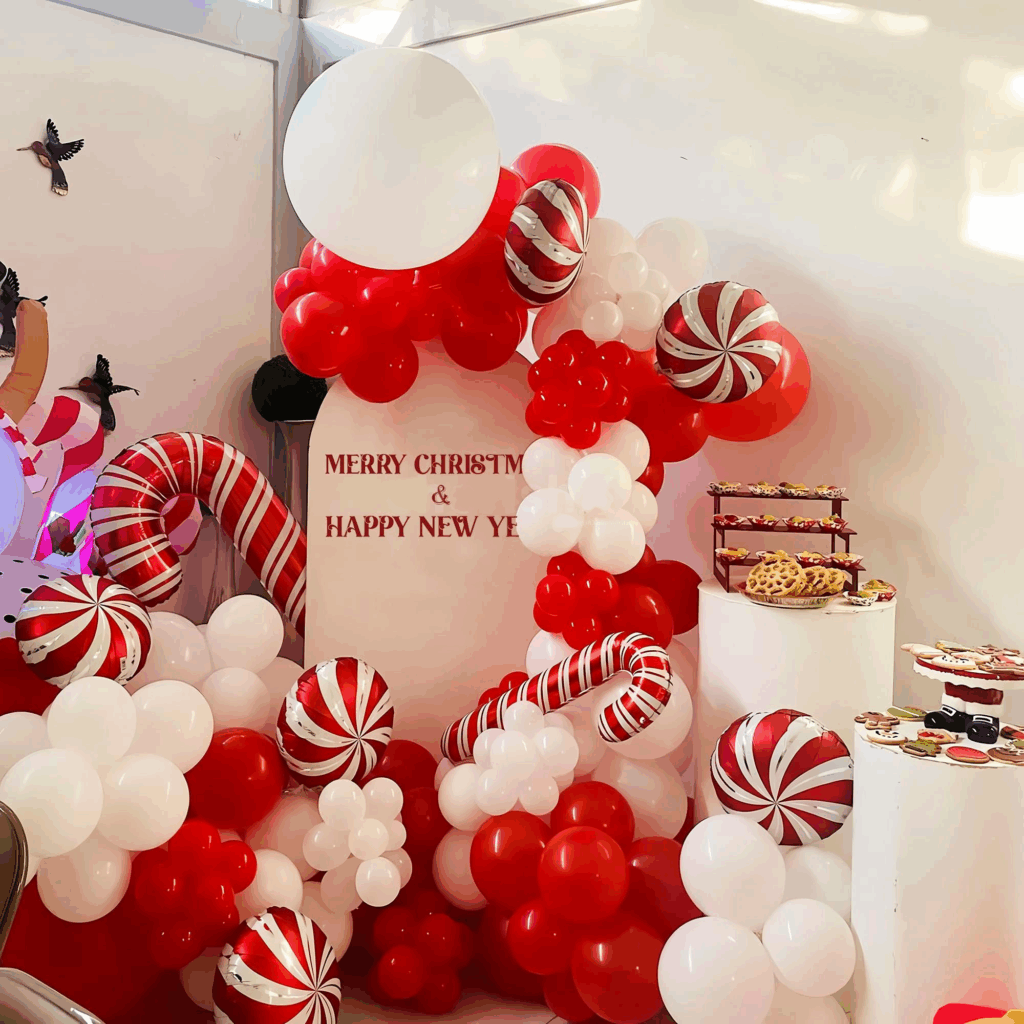 Christmas Décor – Christmas trees, balloon arches, wreaths, and Santa props.
