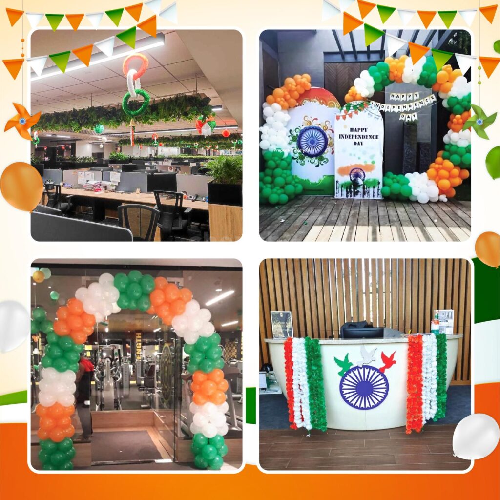 We provide creative Independence Day balloon decoration services, including tricolor arches, flag-themed backdrops, stage setups, office decorations, school décor, and more.